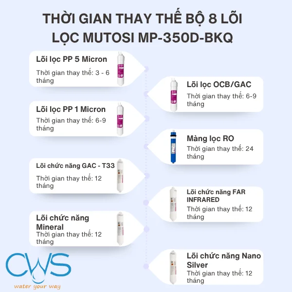Thời Gian Thay Thế Bộ 8 Lõi Lọc Nước Mutosi MP-350D-BKQ Theo Khuyến Nghị Của CWS