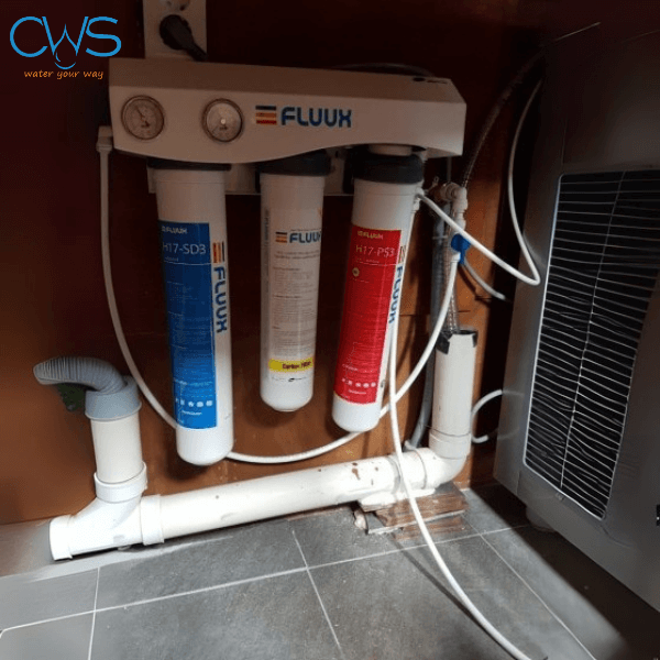 Hình ảnh lắp đặt thực tế bộ lọc đầu nguồn Chungho FLUUX 3 tại quán cà phê