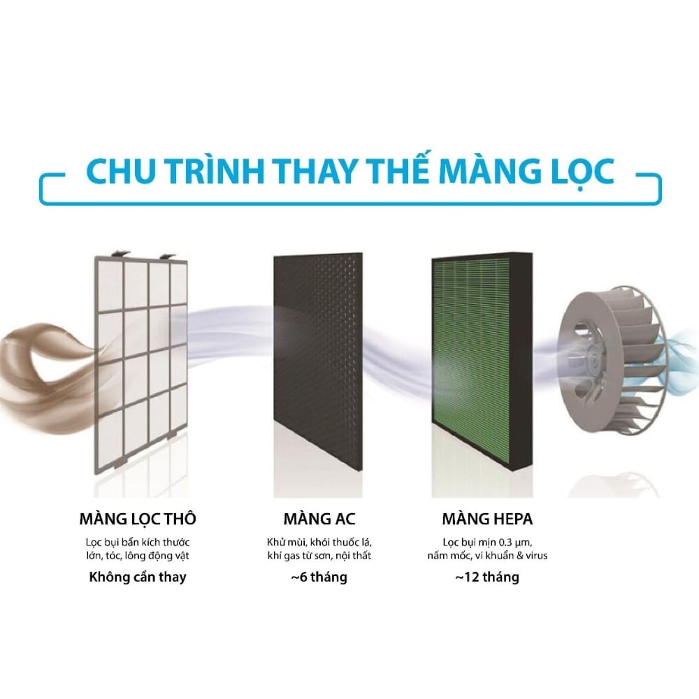 - Màng lọc HEPA (HEPA Filter): Loại bỏ 99,99% virus, vi khuẩn gây bệnh. Thời gian thay: 12 tháng.