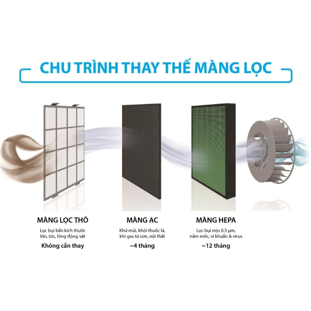 - Màng lọc HEPA (HEPA Filter): Loại bỏ 99,99% virus, vi khuẩn gây bệnh. Thời gian thay: 12 tháng.