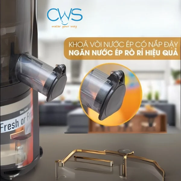 Máy còn có vòi ra nước ép với gioăng cao su hạn chế rò rỉ nước, giữ cho khu vực sử dụng luôn sạch sẽ. Đường kính miệng ống tiếp nguyên liệu 35 mm giúp ép nhanh các loại trái cây nhỏ như dâu tây, cherry mà không cần cắt nhỏ quá nhiều.