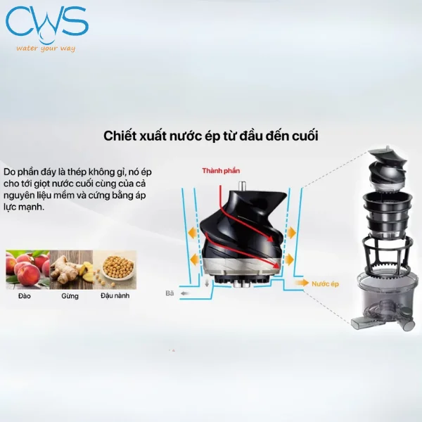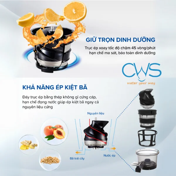 Trục ép xoay với tốc độ 45 vòng/phút hạn chế tối đa nhiệt ma sát, giúp bảo toàn hàm lượng vitamin, enzyme và khoáng chất tự nhiên trong thực phẩm. Lưới lọc bằng inox 304 cao cấp, an toàn sức khỏe, dễ dàng tháo rời để vệ sinh, hạn chế rỉ sét trong quá trình sử dụng, đảm bảo độ bền lâu dài.