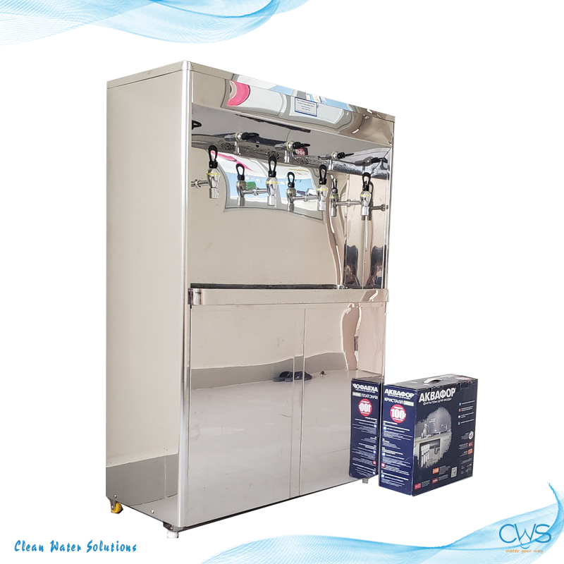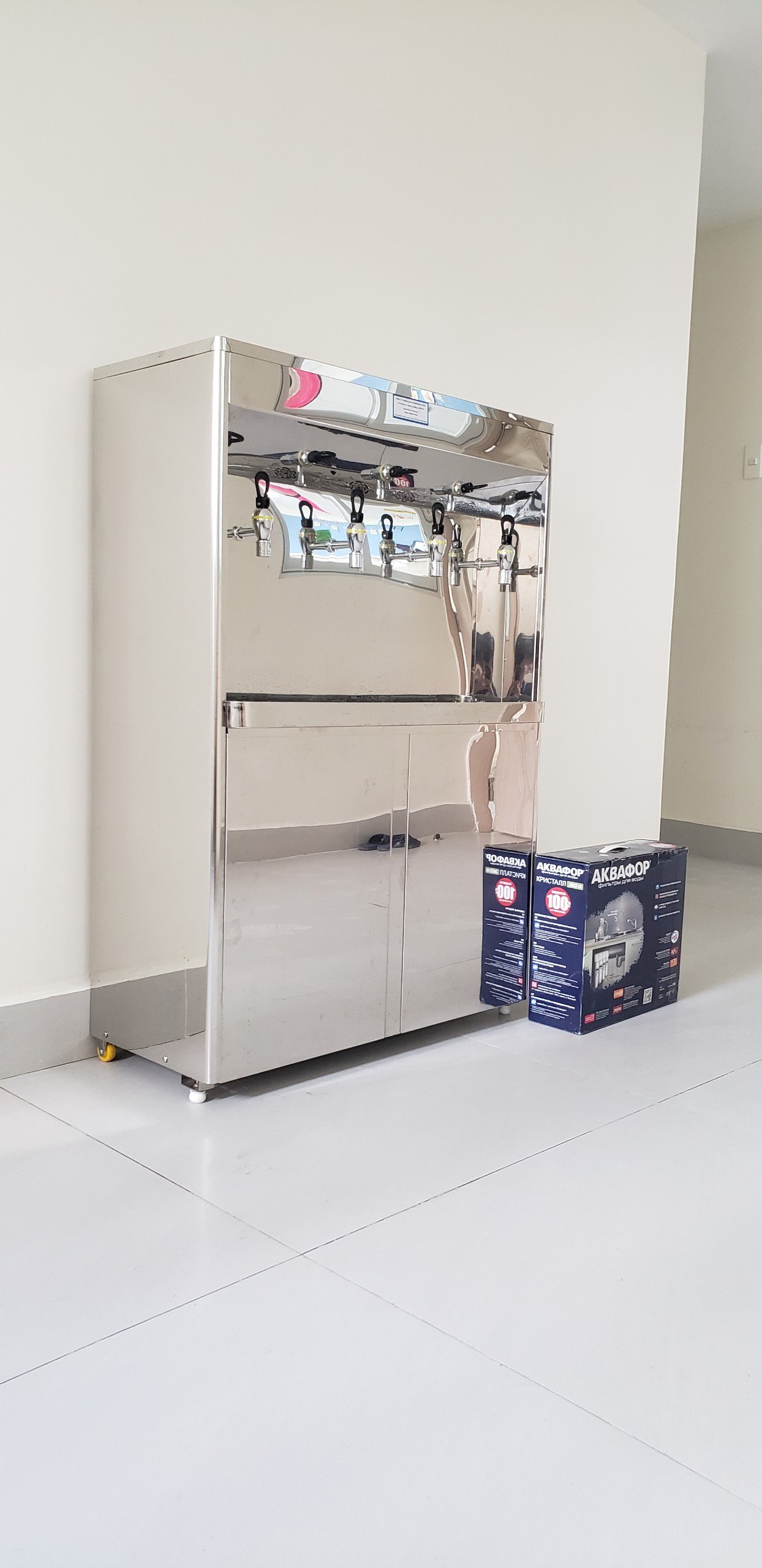 Máy lọc nước nóng lạnh Aquaphor tủ inox 4 vòi sử dụng tại các trường học, văn phòng công ty