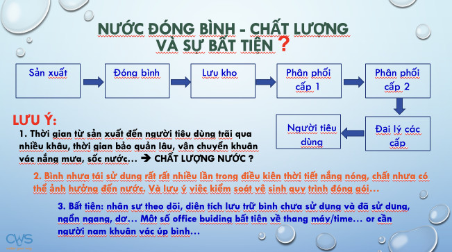 4. Nước từ lúc đóng bình, thời gian lưu kho, qua nhà phân phối cấp 1, 2, đại lý cấp 1, 2, vận chuyển nắng mưa, khuôn vác sốc nước... Vậy bạn có đặt câu hỏi chất lượng nước đến người tiêu dùng có còn chất lượng như ban đầu? Còn đảm bảo được khoáng như quảng cáo?